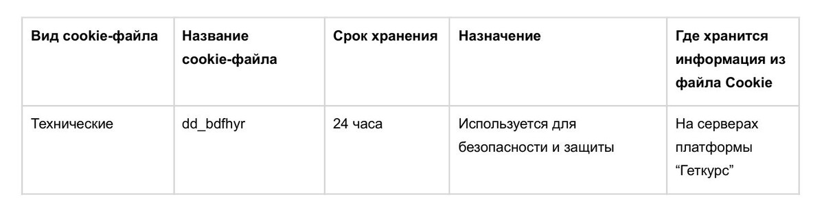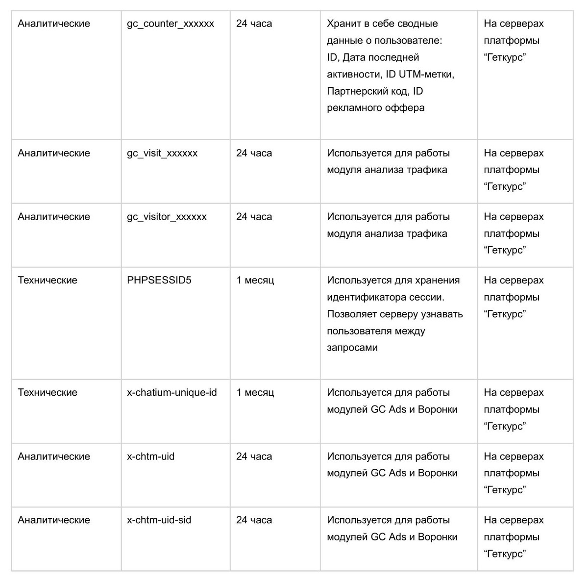 Cookie-файлы устанавливаются Платформой «Геткурс» согласно информации, указанной в таблице: